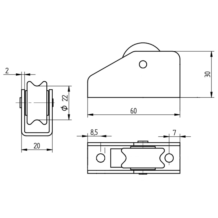 RVS koordgeleider met stalen wiel 28 mm